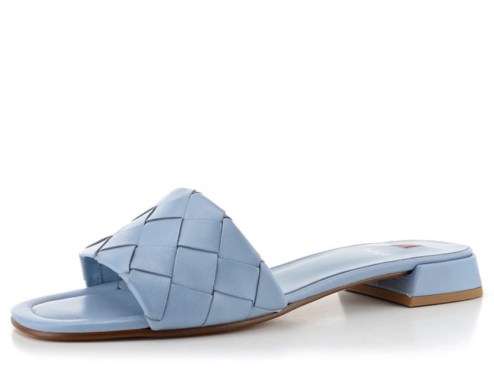 Dámské bledě modré pantofle s páskem z proplétané kůže a s nízkým podpatkem.