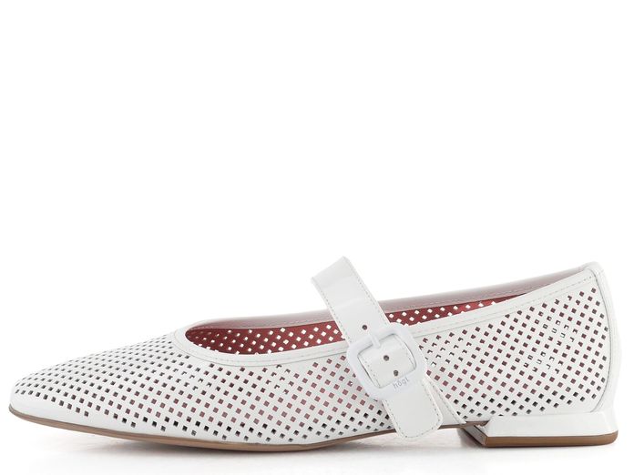 Dámské módní baleríny na nízkém podpatku, v lakované bílé barvě s prořezávaným vzorem na svršku.