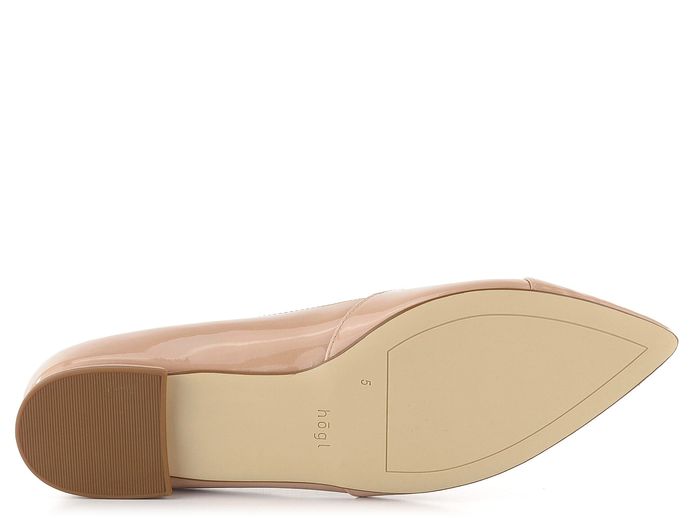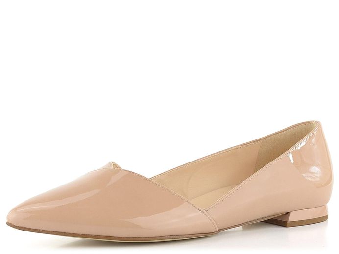 Luxusní dámské špičaté baleríny z lakované kůže v tělové barvě na nízkém potaženém podpatečku.
